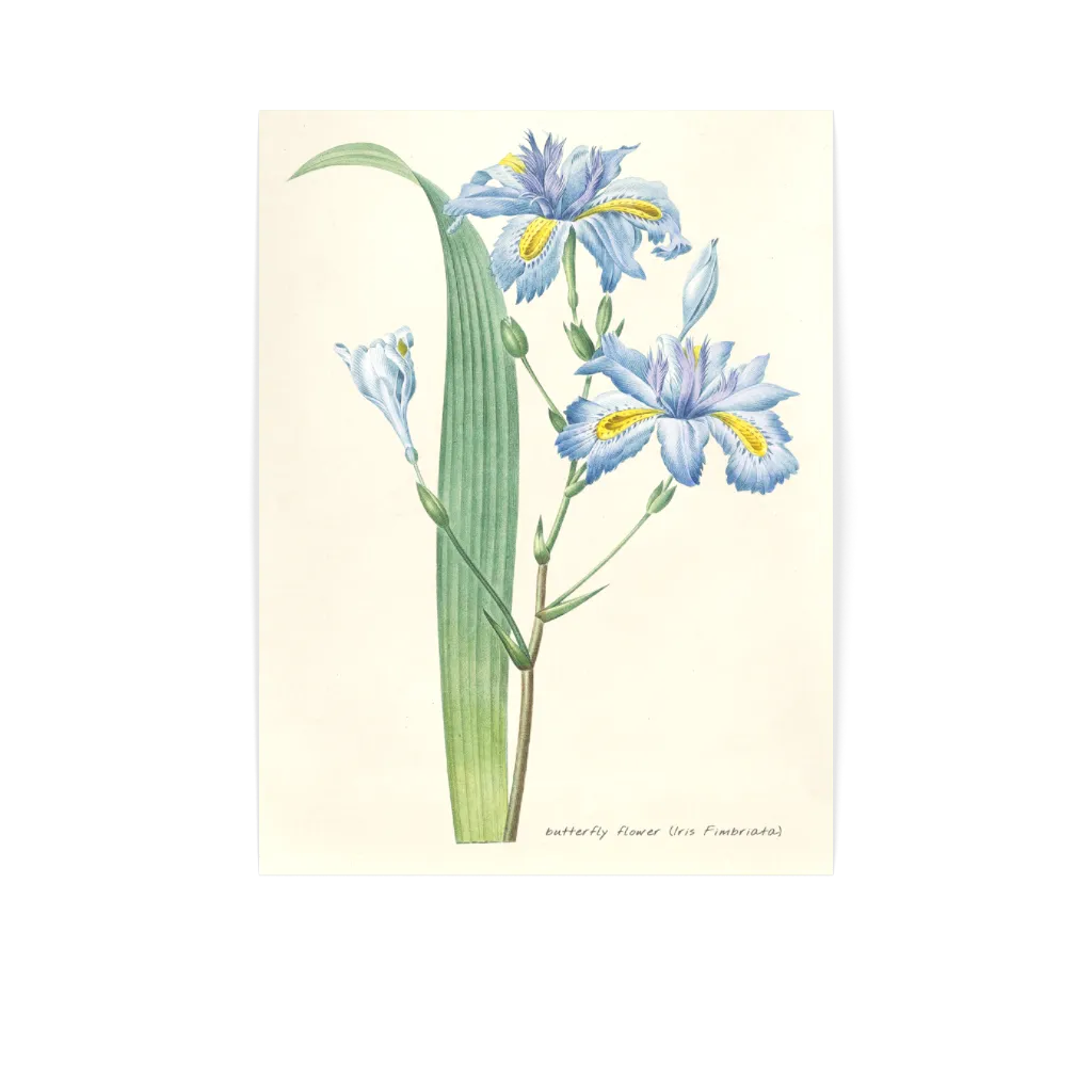 A delicate botanical study of the butterfly iris rendered in soft blues and yellows against a pale ground. The illustration captures the flower's intricate petal structure with scientific precision and artistic grace. This vintage-inspired print brings a sense of quiet contemplation to interiors, softening walls with its gentle palette and graceful forms. The linear quality of the leaves balances the complexity of the blooms.