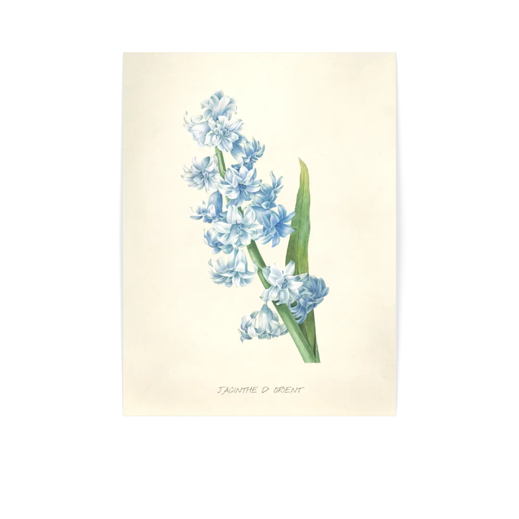 A delicate botanical study of pale blue hyacinth blooms rendered in soft watercolor. The clustered flowers cascade gracefully along the stem, their ruffled petals captured in gentle detail against a neutral background. This print brings quiet refinement to a space, the kind that settles a room without demanding attention. The muted color palette and classical composition suit interiors where subtlety matters.