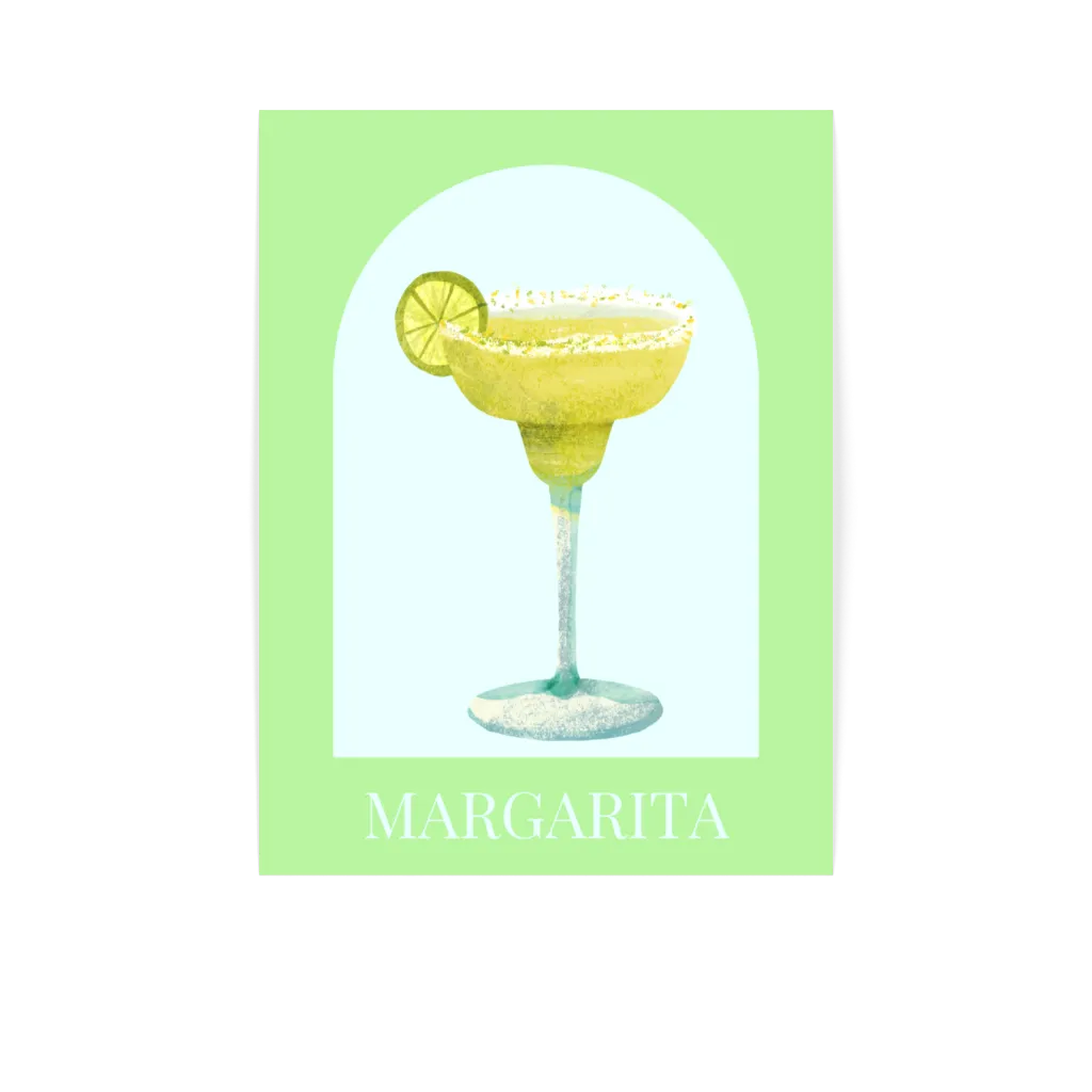 A textured illustration of a classic margarita with salt rim and lime slice brings retro charm to modern spaces. The soft green background and watercolor-style rendering create a relaxed, approachable mood. Light catches the granular salt detail and the translucent quality of the cocktail glass.