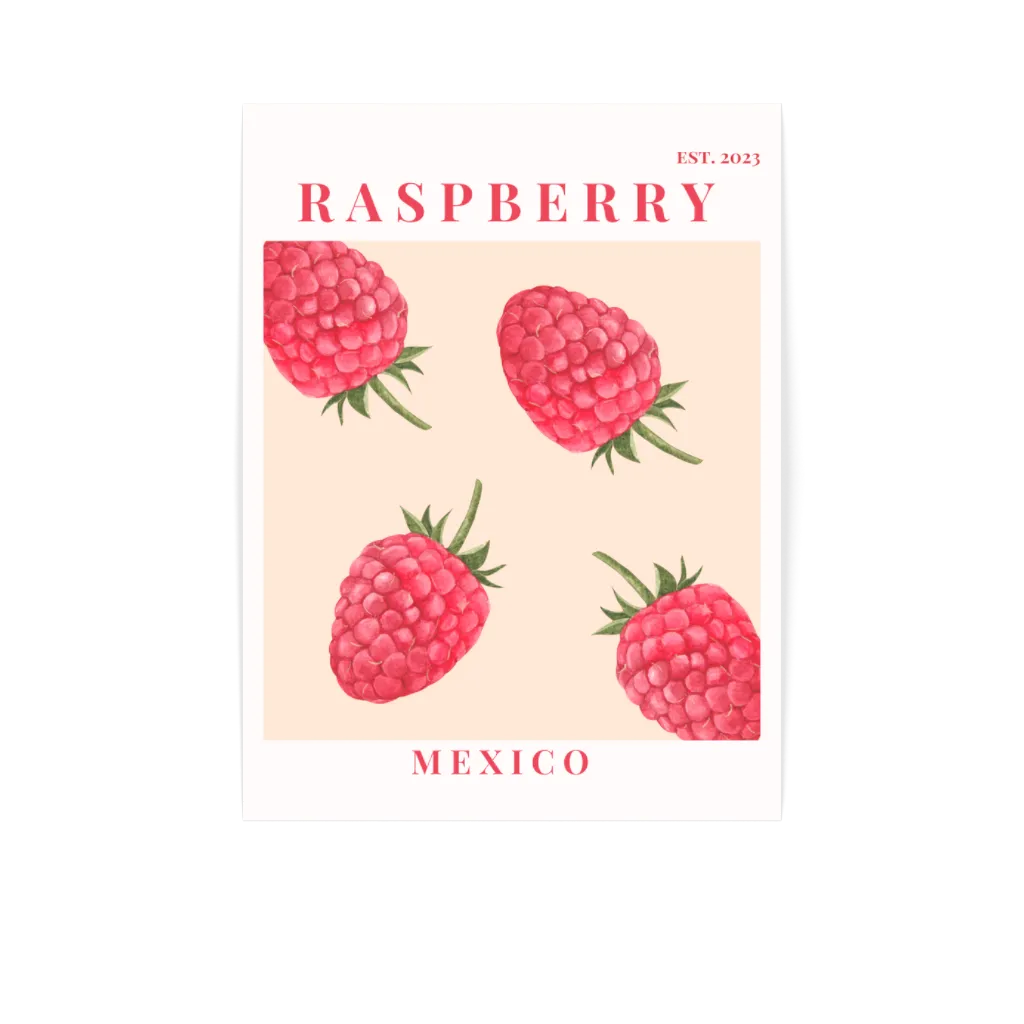 Fresh raspberries arranged on a warm peach background bring natural color and playful energy to any room. This botanical fruit poster balances soft pink tones with vibrant red, creating a cheerful yet grounded presence. The vintage-inspired layout and serif typography add a sense of place and history. Works beautifully in kitchens where it echoes the joy of fresh ingredients, or in dining rooms where it sparks conversation. The gentle color palette softens modern spaces while adding a touch of warmth to neutral walls.