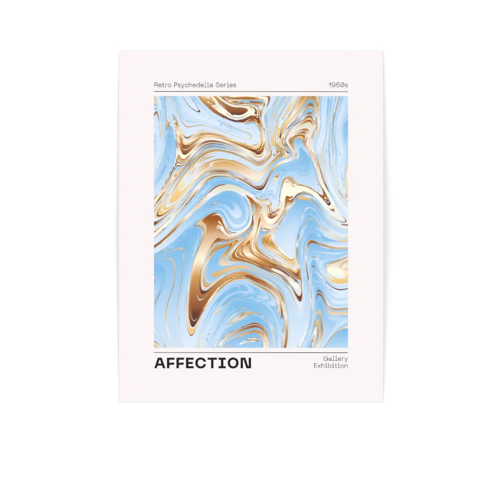 Swirling patterns of sky blue and bronze gold move across the canvas like liquid light. This vintage-inspired psychedelic print recalls the experimental art of the 1960s, when artists explored fluid forms and unexpected color combinations. The marbled effect brings organic movement to any wall, softening modern interiors with retro warmth.