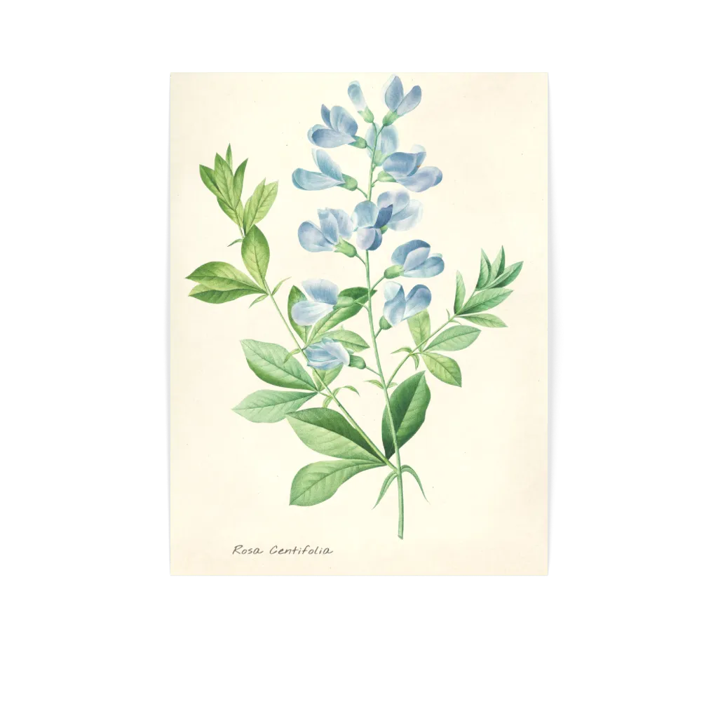 A vintage botanical study of Rosa Centifolia rendered in soft watercolor. Blue-toned petals rise from green stems, their translucent layers captured with delicate precision. The cream background holds the composition in quiet stillness.