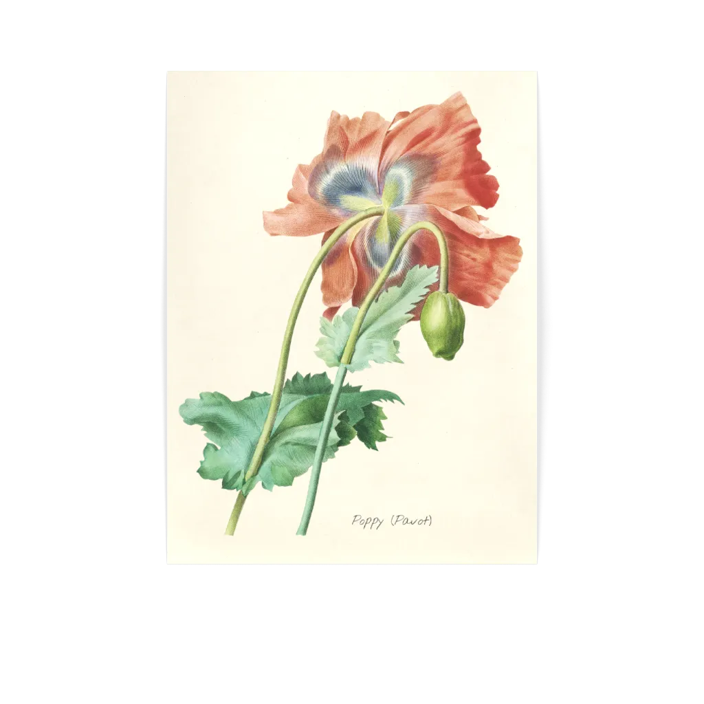 A botanical study from another era. This vintage poppy illustration captures the flower in full bloom, its coral petals unfurling from a center of blue and cream. The watercolor rendering shows delicate veining and natural movement, while the green leaves and seed pod ground the composition. It brings a sense of natural history to any wall, softening modern spaces with organic color and graceful form. The muted background keeps the focus on the botanical detail.
